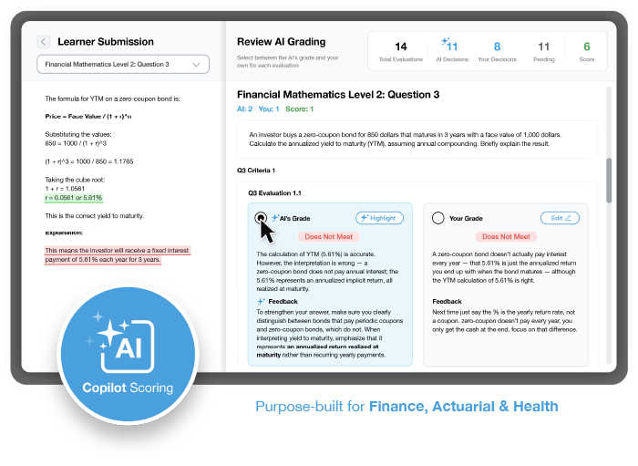 - Align graders before launch using synthetic submissions and readiness reports.